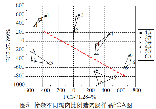 圖5為摻雜不同雞肉比例豬肉腸樣品的主成分分析二維圖。從圖5可見前2個主成分的貢獻率分別為71.284%、27.699%,累計貢獻率98.983%,其余主成分貢獻率僅為1.017%,所以取前2個主成分對應的特征向量所決定的兩維子空間就能夠完全反映樣品的整體數據信息。同時,從圖5還可以看出,摻雜不同雞肉比例的豬肉腸樣品分別聚類在PCA圖中的不同區域,所有樣品相互之間能夠較好地區分,顯著性非常高。聚類區域分布也呈現出一定的規律性,隨著摻雜雞肉比例的增加,分布區域總體按圖中標注虛線的方向發展,即朝PC1增加、PC2下降的方向發展,同時不同分布區域的距離并沒有因為摻雜雞肉比例的增加而出現顯著的變化。