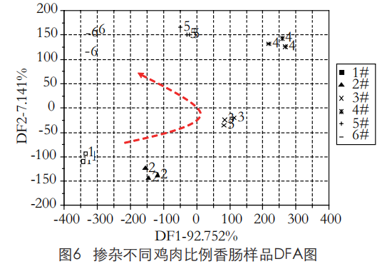 圖6為摻雜不同雞肉比例的香腸樣品判別因子分析圖。從圖6可見前2個判別因子的貢獻率分別為92.752%、7.141%,累計貢獻率99.893%。樣品在圖中的分布按照箭頭所示的方向呈現一定的規律性。具體分析來看,隨著摻雜雞肉比例的增加,分布區域朝DF1先增加后降低、DF2螺旋上升的趨勢發展。結果表明,摻雜不同雞肉比例豬肉腸樣品的DFA分析聚類十分顯著。