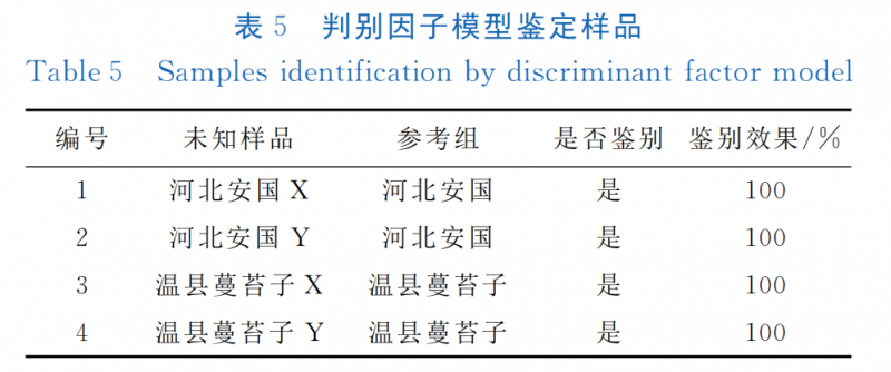 未知樣品分別為屬于河北安國樣品組的河北安國X、河北安國Y及屬于河南溫縣蔓苔子樣品組的河南溫縣蔓苔子X、河南溫縣蔓苔子Y。由此可知判別因子模型為有效模型,可用于不同產地牛膝種子的區分,使PCA結果得到進一步驗證。