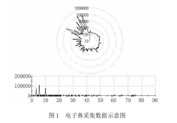 在獲得人工感官評分后,按醇香、陳香、焦香和異香分別對采集到的數據進行定量, 同時通過化學計量學方法使用多變量統計軟件進行分析并建立定量模型。采集到的數據形式如同氣相色譜圖,見圖 1,下半部分是氣相色譜圖,而上半部分是對應的雷達圖。將圖中每一個色譜峰都看作一個傳感器, 而影響不同香氣的指標對應著不同的傳感器,稱之為特征傳感器。同時,對各項指標進行的定量評分研究也都立足于特征傳感器的選擇上。