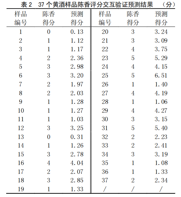 從表 1 可以看出, 所有樣品的醇香得分經交互驗證顯示,驗證準確率為 97.3 %。其中 25 號樣品醇香分值為5 分的酒樣,其預測得分略高,查得此樣品為 40 年陳釀,而 31 號樣品醇香分值為 5 分,預測結果相對接近,查得此樣品為 20 年陳釀。這可能是由于二者年份上的差異加上評分機制最高為 5 分,而導致預測結果略有偏離。在實際感官品評時,不影響其得到最高分值。
