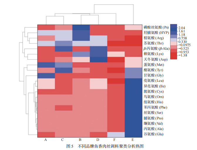 將游離氨基酸采用歸一化法繪制聚類熱圖,結(jié)果如圖 5 所示。由圖 5 可見,21 種氨基酸可分為2 個大聚類,其中聚類 1 大部分是由苦味和無味氨基酸組成,聚類 2 大部分則是由甜味和鮮味氨基酸組成。同時,不同調(diào)料的聚類可分為 2 個大聚類,其中大聚類 1 為樣品 E,聚類 2 由其它 5 種調(diào)料組成,說明樣品 E 與其它樣品的滋味差異明顯。