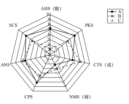 圖2是樣品電子舌滋味強度雷達圖。AHS(酸)、CTS(咸)、NMS(鮮)為專一性傳感器,PKS、CPS、ANS、SCS為非專一性傳感器。圖中可以看出在酸味維度上,A、C較為相似,與B差異大。導致這種差異的原因可能是鮮花椒芽含有更多水分,稀釋了樣品的呈酸味物質所致。在咸味維度,C樣品咸味最弱,B樣品最強。在鮮味維度,C樣品鮮味最強,B樣品略高于A。