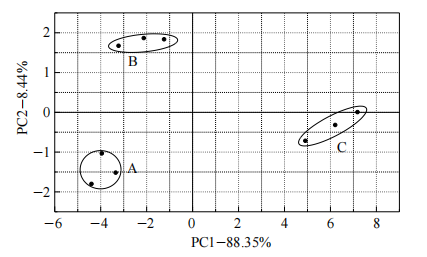 圖3是電子舌和電子鼻數據融合主成分分析結果。PC1+PC2為96.79%(大于80%即可),說明在進行數據降維時,保留了絕大部分樣品的信息,降維可行有效。圖中3個樣品在4個象限均有分布(B在第二象限,A在第三象限,C在第一、四象限均有分布)。A、B差異主要來源于PC2,A、C差異主要來源于PC1。PC1為88.35%,PC2為8.44%。所以A、B差異小,A、B和C差異大,A、C差異最大。說明未添加花椒芽的樣品與添加酥花椒芽的樣品在風味上差異大。