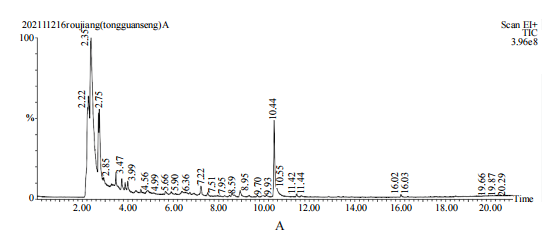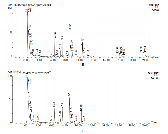 添加鮮花椒芽及油酥花椒芽使產品的風味發生了明顯的變化,對產品進行GC-MS檢測,樣品的總離子流圖見圖4。從圖4中可以看出A、C樣品的出峰時間主要集中在2~11min之間;B樣品的出峰時間集中在2~20min之間。從出峰時間可以看出,A、C與B樣品是有差異的。