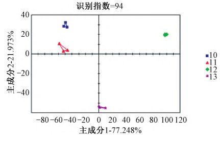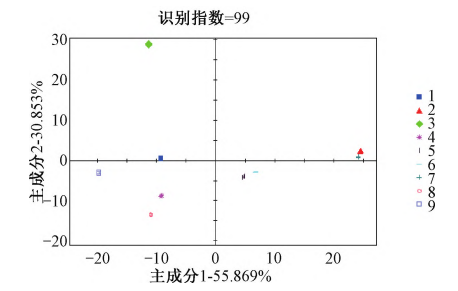 由圖4可知,PC1與PC2的貢獻率之和達到了95.057%,其識別指數達到99,說明基于氣味上的差異能有效區分不同產地地黃樣品。河南溫縣與甘肅所產“北京3號”各單獨分布在一個區域,與其他產區氣味差別較大;山西與陜西所產“北京3號”氣味差別較小,利用AroChemBases數據庫對篩選出的差異較大的色譜峰進行定性可知,生地黃氣味差異可能由于乙醛、乙醇、2,3?丁烷、乙腈、己醛等揮發性氣體含量差異引起,說明使用電子鼻能迅速區分同一品種不同產地生地黃。