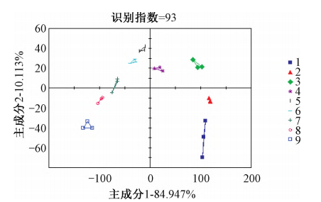 懷區9種不同主栽品種懷地黃RSD分別為0.42%、1.35%、0.56%、0.34%、0.42%、0.22%、0.22%,樣品3次重復間相對標準偏差都比較小,說明樣品在重復測試過程中電子舌儀器的穩定性、重現性好。由圖5可知,PC1與PC2的貢獻率之和達到了95.060%,其識別指數為93,說明這9種生地黃樣品滋味能夠快速地通過電子舌很好區分開來。在主成分分析圖中,樣品間的相對距離越近,則樣品整體滋味越接近,其中“金九”與“85?5”樣品的相對距離最近,滋味差別最小;“噸王”與“沁懷”的相對距離最遠,滋味差別最大。