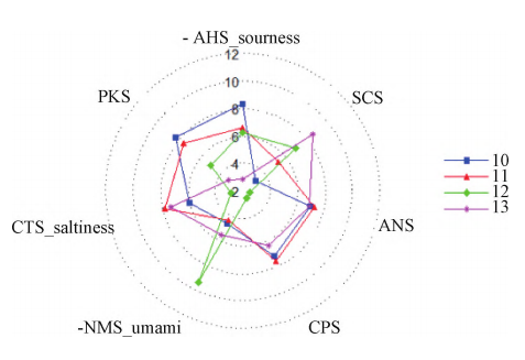 從圖6中能更直觀地看出樣品間在滋味上有差別,不同主栽品種懷地黃在不同傳感器上信號反應強度存在差異,其中“噸王”在酸味傳感器上相對強度最強,“師大地黃1號”在咸味傳感器上相對強度最強,“懷豐”在鮮味傳感器上相對強度最強。