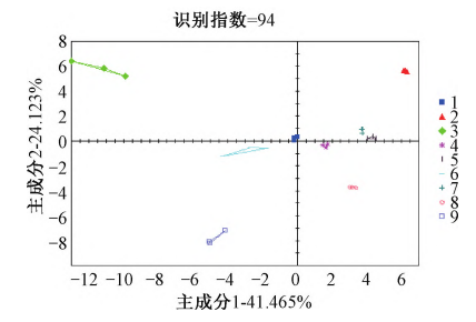由圖3可知,PC1與PC2的貢獻率之和達到了91.644%,其識別指數達到96,說明基于氣味上的差異能有效區分這9種懷地黃樣品。在主成分分析圖中,樣品間的相對距離越近,則樣品整體氣味越接近,“師大地黃1號”與“師大地黃2號”樣品的相對距離最近,氣味差別較小;懷地黃主栽品種“懷豐”分布在左側區域,其它樣品分布在右側區域,且各品種間存在一定相對距離,說明“懷豐”氣味與其它樣品差異較大。