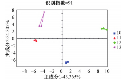 圖10中PC1與PC2之和達到了67.67%,其區分指數為91,說明各個樣品之間在顏色、氣味和滋味整體上存在差異。河南溫縣、山西、陜西、甘肅所產“北京3號”分別分布在主成分分析圖的4個區域,且相對距離較遠,差異明顯,不同產區的生態因子造成不同產區生地黃整體感觀差異。