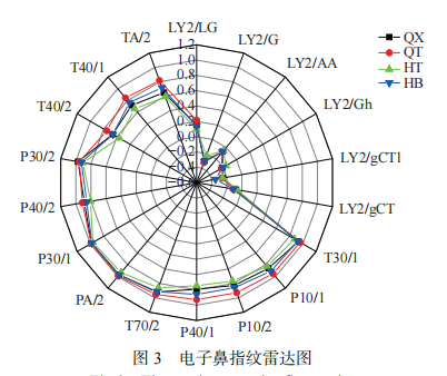 四個部位電子鼻氣味指紋雷達圖3表明:樣品HT在P10/1、P10/2、P40/1與其他樣品出現差異,P型傳感器一般對極性化合物和非極性化合物敏感;樣品HT與QT在T40/2、T40/1、TA/2區分較為明顯,而T型傳感器對氧化氣體和含硫化合物敏感,說明在含硫化合物含量上樣品HT與樣品QT差異較大。