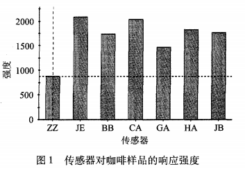該 實 驗 所 用 的 傳 感 器 為 非 特 異 性 、交 互 敏 感 型 傳 感器 。7個 傳 感 器 分 別 是 zz、JE、BB、CA、GA、HA 和 JB。各 傳 感 器 對 風 味 物 質 普 遍 響 應 ,沒 有 絕 對 的 對 應 關 系 。圖 1表 示 傳 感 器 對 咖 啡 樣 品 的 響 應 強 度 圖 ,其 中 JE 和 CA 對 咖 啡 樣 品 的 響 應 強 度 最 大 ,傳 感 器 響 應 強 度 JE>CA>HA>JB。