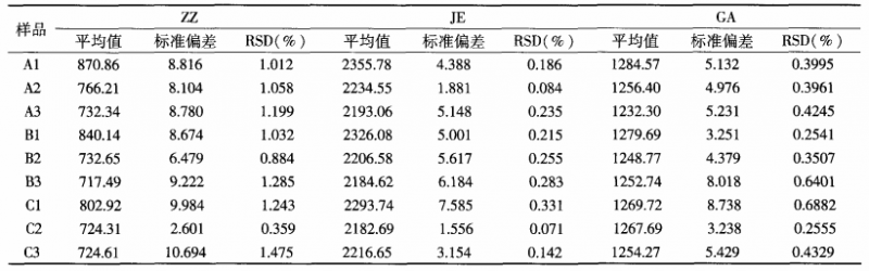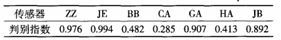 表 1表 示 各 傳 感 器 對 樣 品 的判 別 指 數 ,而 判 別 指 數 JE >ZZ>GA>JB,可 見 傳 感 器 響 應 強 度 與 對 樣 品 的 差 異 判 別 能 力 不 是 線 性 關 系 ,如 ZZ雖 響 應 強 度 較 小 但 對 咖 啡 樣 品 有 較 高 的 差 異 判 別 指 數 ,經 過 判 別 指 數 和 響 應 強 度 綜 合 確 定 傳 感 器 為 JE、GA 和 ZZ。傳 感 器 對 咖 啡 樣 品 響 應 強 度 值 、標 準 偏 差 和 相 對 標 準 偏 差 (RSD) 見 表 2。