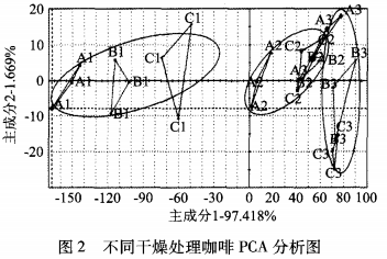 PCA 分 析 能 較 好 的 區 分 樣 品 ,主 成 分 1的 貢 獻 率 高 達 97.418% ,主 成 分 2的 貢 獻 率 為 1.669% 。三 組 實 驗 均 能 較 好 區分 樣 品 ,且 樣 品 2與 樣 品 3之 間 的距 離 遠 小 于 樣 品 1與 樣 品 3之 間 的 距 離 ,說 明 熱 風 干 燥 會 造 成 咖 啡 風 味 變 化 ,其 與 太 陽 光 自然 風 味 相 差 較 遠 ,半 熱 風 干 燥 半 自然 干 燥 雖 也 會 造 成 風 味 變 化 ,但 與 太 陽 光 自然 干 燥 風 味 相 差 不 大 。說 明 半 熱 風 干 燥 半 自然 干 燥 是 咖 啡 在 惡 劣 環 境 下 ,咖 啡 濕 豆 干 燥 有 效 的 補 充 。