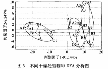 電 子 舌 能 夠 較 好 的 區 分 不 同 干 燥 處 理 方 式 的 咖 啡 ,主 成 分 1的 貢 獻 率 及 判 別 因 子 1的 貢 獻 率 , 均 達 到 90% 以 上 ,PCA 分 析 與 DFA 分 析 證 明 結 論 一致 ,說 明 兩 種 分 析 方 式 對 咖 啡 樣 品 均 具 有 良 好 的 區分 。