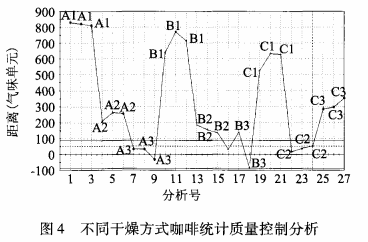 咖 啡 濕 豆 干 燥 通 常 以 太 陽 光 自然 干 燥 為 主 ,該 實 驗 以 太 陽 光 自然 干 燥 為 參 照 對 象 ,由 于 三 組 重 復 , 均 有 自然 干 燥 。此 采 用 A3為 標 準 進 行 SQC分 析 ,經 電 子 舌 檢 測 得 出 圖 4。