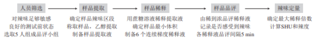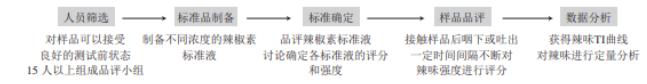 時間-強度( time-intensity,TI)法是一種用于評價樣品辣味隨時間變化的感官評價手段,是經(jīng)典感官評分方法的延伸,這種方法常利用不同濃度的辣椒素標(biāo)準(zhǔn)品使參評人員建立相對統(tǒng)一的感官評價標(biāo)準(zhǔn),并要求品評員在攝入樣品后的一段時間內(nèi)持續(xù)地對辣味的強弱進行打分。TI法的基本操作流程如下所示。