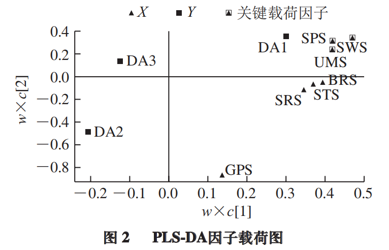 為探索電子舌檢測能否用于工夫紅茶茶湯滋味的判別,以電子舌7 個傳感器響應值為X變量,以茶湯滋味分組(甜純、純正、欠純)為Y變量做PLS-DA。PLS-DA是一種有監督的模式識別方法,相對于PCA所得的投影通常可獲得更好的分類效果。如圖1B所示,3 類(甜純、純正、純)茶湯的聚類結果類似于PCA的結果(R2x =1,R2Y =0.61,Q2 =0.512)。Q2 大于0.5,表明模型具有較好的預測能力。過擬合是PLS-DA模型的一個常見問題。為進一步驗證PLS-DA模型的可靠性,對該模型進行置換檢驗驗證(圖1C)。將模型建立時定義的Y矩陣的變量隨機排列100 次,得到R2和Q2 截距分別為(0.0,0.029)和(0.0,-0.399),表明PLS-DA模型穩定可靠,未存在過擬合,可用于不同滋味的判別。