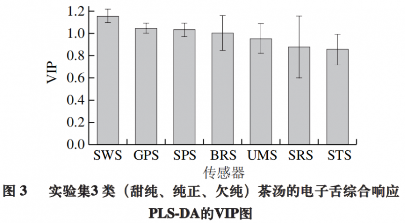 為進一步探明電子舌7 根傳感器的響應值對滋味分組的貢獻,篩選出影響甜純滋味識別的關鍵傳感器,將上述PLS-DA模型做載荷分析。如圖2所示,對甜純滋味識別影響較大的變量可能為SWS(甜)、UMS(鮮)、SPS(綜合),其w×c值分別為0.47、0.42、0.42,以變量SWS(甜)貢獻為最大。進一步采用變量投影重要性(variable important for the projection,VIP)篩選關鍵差異變量,如圖3所示。結果表明,VIP值大于1.0的變量包括SWS(甜)、GPS和SPS(復合味覺)及BRS(苦),其中以SWS(甜)的VIP值為最高。SWS甜味傳感器對甜純組茶湯的響應顯著高于純正組和欠純組(P<0.001),而對于純正組和欠純組的響應差異則不顯著(圖4)。上述結果表明SWS甜味傳感器可能是識別甜純滋味的關鍵因子。