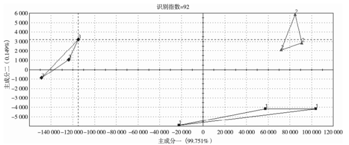 由圖1可知,第一主成分對數據信息貢獻率為99.751%,第二主成分貢獻率為0.149%,兩個主成分的總貢獻率為99.900%,表明此圖譜能夠較好地反應所測樣品中氣味數據的完整性。識別指數為92,在80~100之間,表示該數據區分分析結果為有效結果,識別指數值越大,區分效果越佳。