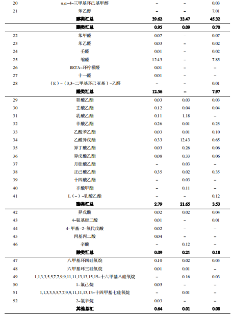 一類香氣在皮渣發酵酒和果漿發酵酒中的含量分別為16.37%和11.99%,且種類相近,而清汁發酵酒香氣物質含量為22.49%。因此,一類主成分在皮渣發酵酒和果漿發酵酒中基本相同,和清汁發酵酒對比明顯。二類香氣在皮渣發酵酒和果漿發酵酒中的含量分別為8.06%和6.59%,在清汁發酵酒中的含量僅為0.97%,對比結果與一類主成分類似。