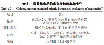 香氣是堅果風味的重要組成部分,由蛋白質、脂肪、糖類等物質在烘焙過程中經美拉德反應、脂質氧化、糖降解產生,其濃度隨烘烤時間的延長而增加。堅果的香氣成分包含雜環類氧化物(吡嗪類、呋喃類、吡咯類、吡啶類、吲哚類、噻吩類和噻唑類)和含氧衍生物(烴類、醇類、醛類、酸類、酮類和酯類)兩大類,其中烘烤堅果主要的香氣物質是吡嗪類、呋喃類以及醛類化合物,如2,5-二甲基吡嗪(烘烤堅果味)、2,6-二甲基吡嗪(烘烤堅果味)、2-乙基-5-甲基吡嗪(草味、堅果味)、乙基吡嗪(爆米花味)、3-乙基-2,5-二甲基吡嗪(咖啡味)、3-甲基丁醛(巧克力味)、2-甲基丁醛(焦糖味)、呋喃醛(生土豆味)、苯乙醛(甜芳香味)、苯甲醛(杏仁香味)等。堅果種類或烘焙條件不同會造成堅果風味的差異,此外,不恰當的加工方式和貯存條件會使堅果中的不飽和脂肪酸氧化,產生“哈喇味”,影響堅果質量。 堅果的感官品質是影響其質量的重要指標。目前,如表2所示,通常采用GB/T22165—2008《堅果炒貨食品通則》對堅果類食品的色澤、顆粒形態、口味、雜質進行較為籠統的評價,不利于堅果類食品行業整體質量的提高,因此,堅果類食物的感官評價方法可從以下方面進行補充。