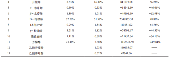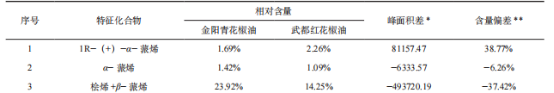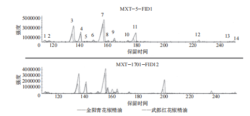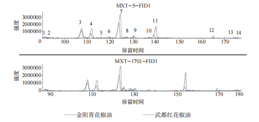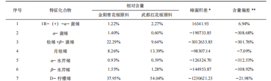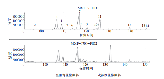 花椒作物在我國很多地區(qū)都有種植,花椒的揮發(fā)油是花椒香氣的主要來源,也是反映花椒香氣的主要指標,花椒中揮發(fā)油的含量及組成成分不僅受到花椒品種、產(chǎn)地環(huán)境因子(如產(chǎn)地氣候、雨量、日照時間、土質等)的影響,還受到提取加工方法、提取部位和采收時期等外在因素的影響。 超快速氣相電子鼻技術具有分析速度快、靈敏度高和檢測費用低等優(yōu)點。超快速氣相電子鼻將雙快速氣相色譜檢測與基于多變量統(tǒng)計的強大數(shù)據(jù)處理和感官及化學表征(Arochembase)的可選模塊相結合,利用超快速氣相電子鼻技術,解析不同品種花椒及花椒提取物揮發(fā)性化合物,通過主成分分析建立產(chǎn)品有效判別模型,同時解析花椒物質構成。 不同產(chǎn)地花椒原料、花椒精油產(chǎn)品、花椒油產(chǎn)品、nC6-nC16標準溶液。 超快速氣相電子鼻;零空氣發(fā)生器;氫氣發(fā)生器;20mL頂空進樣瓶,電子天平。 花椒:取0.2g花椒顆粒于20mL頂空進樣瓶中,迅速加蓋密封檢測,設置3個平行樣品,降低檢測誤差。 花椒精油:將花椒精油搖晃均勻后,取20uL于20mL頂空進樣瓶中,加蓋密封檢測,每個樣品設置3個平行樣。 花椒油:將花椒油搖晃均勻后,使用電子天平稱取0.1g于20mL頂空進樣瓶中,加蓋密封檢測,設置3個平行樣品。 花椒原料:樣品量0.2g,進樣體積500uL,孵化溫度80℃,孵化時間20min,50℃恒溫30s,1℃/s速率升溫至80℃恒溫30s,3℃/s速率升溫至125℃恒溫10s,3℃/s速率升溫至250℃恒溫11s。 花椒精油:取樣量100μL,捕集溫度40℃,孵化溫度60℃,孵化時間10min,載氣流量30mL/min;進樣量1000uL,進樣口溫度200℃,閥溫度為250℃;FID溫度260℃,升溫程序:初始溫度45℃,保持35s,1.0℃/s升至70℃,保持30s,0.5℃/s升至140℃,3.0℃/s升至250℃,保持21s,采集時間共計288s。花椒油:取樣量0.1g,捕集溫度40℃,孵化溫度60℃,孵化時間20min,載氣流量30mL/min;進樣量500uL,進樣口溫度200℃,閥溫度為260℃,F(xiàn)ID溫度為260℃,升溫程序:初始溫度50℃,保持30s,1.0℃/s升至85℃,保持30s,1.0℃/s升至125℃,保持10s,3.0℃/s升至250℃,保持10s,采集時間共計197s。 將裝有樣品的頂空小瓶按照順序依次放入樣品盤,每3個平行樣品后面放入一個空瓶,目的是為了消除樣品帶來的信號干擾,選擇程序進行樣品分析。 使用Heracles超快速氣相電子鼻自帶軟件Alphasoft進行樣品數(shù)據(jù)處理,明確揮發(fā)性風味物質種類與含量。 利用正構烷烴標準溶液(nC6-nC16)進行校準,進行保留時間與保留參數(shù)之間的轉換,利用超快速氣相電子鼻自帶數(shù)據(jù)庫AroChembase數(shù)據(jù)庫對樣品中的成分進行定性分析,采用峰面積歸一法對目標化合物進行定量分析,確定各香氣成分相對含量。 采用正構烷烴標準溶液(nC6-nC16)對檢測方法進行校準,結合超快速氣相電子鼻自帶AroChembase數(shù)據(jù)庫對樣品中主要揮發(fā)性成分進行定性分析,推測得到匹配度高的化合物。 通過對比色譜圖(圖1)發(fā)現(xiàn),樣品間的出峰時間及出峰位置基本一致,峰面積間存在差異,說明樣品中揮發(fā)性成分的種類基本一致,含量上存在略微差異。 青花椒原料中共分析出11種含量較高成分,紅花椒原料中共分析出13種含量較高成分,乙酸芳樟酯與乙酸香葉酯在青花椒中未曾檢測出。通過計算,可知青、紅花椒不僅成分種類上有差異,各成分含量上同樣差異明顯。除1R-(+)-α-蒎烯、1,8桉葉素、乙酸芳樟酯、乙酸香葉酯外,其他成分均是青花椒中含量較紅花椒高。其中,青紅花椒原料中芳樟醇含量差別最大,差異最為明顯,D-檸檬烯含量差別較大,但相對偏差不大,推斷不是造成青紅花椒風味不同的主要差異。乙酸芳樟酯、乙酸香葉酯僅存在于紅花椒原料中,由此可利用花椒原料產(chǎn)品中芳樟醇、乙酸芳樟酯、乙酸香葉酯含量區(qū)分花椒原料種類。 表1 武都紅花椒、金陽青花椒原料特征化合物相對含量與峰面積差異 青花椒精油中共分析出11種含量較高成分,紅花椒精油中共分析出13種含量較高成分,乙酸芳樟酯與乙酸香葉酯在青花椒中未曾檢測出,與原料表現(xiàn)一致。通過計算峰面積差值和含量偏差可知,乙酸芳樟酯等酯類物質僅存在于紅花椒中。1R-(+)-α-蒎烯、月桂烯、D-檸檬烯、1,8桉葉素在紅花椒精油中含量較高,其他組分在青花椒精油中含量較高,和原料情況不一致,可能和提取工藝有關。其中芳樟醇含量差別最大,差異最為明顯,乙酸芳樟酯、乙酸香葉酯僅存在于紅花椒精油產(chǎn)品中,由此可利用花椒精油產(chǎn)品中檜烯、β-蒎烯、芳樟醇含量和乙酸芳樟酯、乙酸香葉酯等酯類物質存在與否來區(qū)分花椒精油種類。 表2 武都紅花椒精油、金陽青花椒精油特征化合物相對含量與峰面積差異