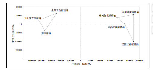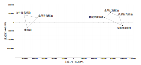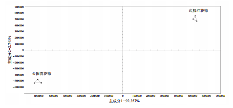 青花椒油中共分析出11種含量較高成分,紅花椒油中共分析出13種含量較高成分,乙酸芳樟酯與乙酸香葉酯在青花椒油中未曾檢測出。 通過計算峰面積差值和含量偏差可知,乙酸芳樟酯等酯類物質僅存在于紅花椒油中,與精油情況一致,青紅花椒油中芳樟醇含量差別最大,差異最為明顯,乙酸芳樟酯僅存在于紅花椒原料中,由此可利用花椒精油產(chǎn)品中檜烯、β-蒎烯、芳樟醇含量和乙酸芳樟酯、乙酸香葉酯等酯類物質存在與否來區(qū)分花椒精油種類。對青紅花椒原料及花椒提取物進行指紋圖譜與物質定性分析,青紅花椒在成分種類上有差異,紅花椒成分較青花椒復雜,主要體現(xiàn)在乙酸芳樟酯、乙酸香葉酯等酯類和醛類物質上;青紅花椒各成分相對含量上差異明顯,其中芳樟醇、檜烯差異最為明顯,D-檸檬烯含量差別大,但差異貢獻度不大;芳樟醇、乙酸芳樟酯等成分可用來鑒別青紅花椒產(chǎn)品類別,且電子鼻分析速度快,可大大節(jié)約成本。 表3 武都紅花椒油、金陽青花椒油特征化合物相對含量與峰面積差異 主成分分析(PCA)是一種常見的多元統(tǒng)計方法,主要通過將采集的多指標進行數(shù)據(jù)轉換與降維,使用線性分類處理降維的特征向量,盡可能捕集數(shù)據(jù)集間最大差異,從整體層面上直觀地展示樣品分布。對花椒原料、花椒精油、花椒油進行主成分分析,由圖4原料主成分分析可以看出,兩種花椒原料之間存在顯著差異,現(xiàn)有數(shù)據(jù)可對未知產(chǎn)地的原料進行產(chǎn)地區(qū)分,前提是原料來自兩個產(chǎn)地。后續(xù)可收集其余產(chǎn)地花椒原料,積累大量數(shù)據(jù),建立原料質量標準,對實際應用中采購、生產(chǎn)、銷售提供指導性建議。 對6類花椒精油樣品進行PCA分析,結果如圖5所示,PC1與PC2相加大于91.38%,代表被檢測樣品中絕大部分信息,說明實驗的花椒精油樣品成分存在差異,呈現(xiàn)不同類型風味,主成分分析能對不同種類花椒精油進行識別與區(qū)分。 對四類花椒油樣品進行PCA分析,結果如圖6所示,PC1方差貢獻率為89.896%,PC2的方差貢獻率為0.953%,兩者累計方差為90.849%,主成分顯示樣品中絕大部分信息,說明實驗的花椒油樣品成分存在差異,呈現(xiàn)不同類型風味,主成分分析能對不同種類花椒油進行識別與區(qū)分。 利用超快速氣相電子鼻技術,解析不同產(chǎn)地花椒及花椒提取物指紋圖譜,明確花椒及花椒提取物揮發(fā)性風味物質,芳樟醇、乙酸芳樟酯等成分可用來鑒別青紅花椒產(chǎn)品類別,且電子鼻分析速度快,可大大節(jié)約成本,利用超快速氣相電子鼻技術可識別花椒中的關鍵香氣成分,為花椒品種篩選、產(chǎn)地識別和深加工提供理論依據(jù)。