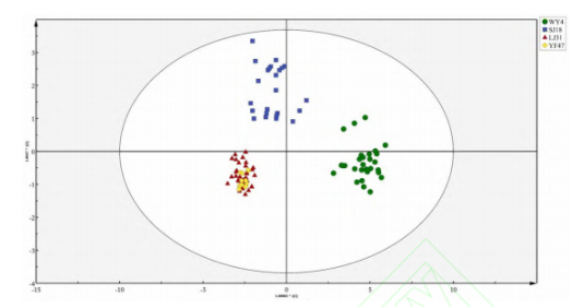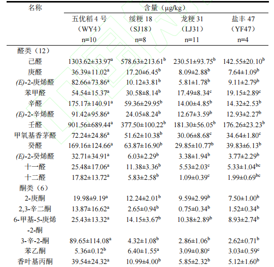 隨著經濟的快速增長和人民生活水平的大幅提高,使得人們更青睞高品質的稻米。香氣作為大米食味品質中的重要組成部分對大米最終的品質呈現起著關鍵作用。大米香氣受多種因素影響,比較常見的有遺傳、種植、加工、貯藏等。 為探究4種我國東北代表性粳米的香氣組分差異,本研究通過HS-SPME-GC-MS和快速氣相電子鼻技術對4種粳米進行分析研究,通過OPLS-DA模型構建、關鍵香氣成分篩選、層次聚類分析(HCA)熱圖等方法初步揭示4種粳米香氣組分差異。 選用的粳米品種為五優稻4號(香米)、綏粳18(香米)、龍粳31(非香米)、鹽豐47(非香米),各品種樣品數量分別為10、8、11、4,共計33個樣品。 粳米樣品按照以下方式處理。稱取10.00g粳米于研磨機中研磨3次,研磨功率為60Hz,時間為5s,間隔為10s。取2.00g粉碎樣品于20mL磁吸螺旋蓋小瓶中。在空白瓶加入用乙醇稀釋10000倍的二辛(0.822g/mL)10μL用來外標定量。所有樣品設置3個平行,每3個樣品進行一次空白實驗。 色譜柱為RXI-5MS極性柱(RESTEK;30m×0.25mm內徑×0.25μm膜厚)。色譜柱升溫程序:柱初溫為30℃,保持4min,以5℃/min升溫至250℃,保持在250℃下3min。載氣為高純氦氣,流速為1.5mL/min,不分流。 稱取10.00g粳米于研磨機中研磨3次,研磨功率為60Hz,時間為5s,間隔為10s。取2.00g粉碎樣品于20mL磁吸螺旋蓋小瓶中。 孵化溫度70℃,捕集阱初始溫度40℃,捕集阱最終溫度250℃,進樣口溫度200℃,檢測器溫度260℃;孵化時間25min,孵化爐轉速500r/min,進樣體積5000μL,進樣體積流量125μL/s,進樣持續時間45s,捕集阱分流速率10mL/min,捕集持續時間50s,柱溫的初始溫度50℃,柱溫程序升溫方式1℃/s至80℃、3℃/s至250℃,保持21s;采集時間110s;FID增益12。 通過正構烷烴(C6~C16)進行校準,將保留時間轉化為保留指數,然后通過Kovats保留指數定性,在Arochembase數據庫中對化合物進行定性分析。 通過HS-SPME-GC-MS和快速氣相電子鼻對我國東北地區4種代表性粳米的揮發性成分及香氣組分進行分析鑒定,除去對香氣貢獻較小的烷烴和雜質,GC-MS共鑒定出24種香氣成分,包括醛類12種、酮類6種、雜環類3種、烯烴類2種、酯類1種(表1);快速氣相電子鼻共檢測到82個主要峰,通過相關指數篩選和比對GC-MS數據后,共鑒定出13種香氣成分(表2),包括醛類8種、醇類2種、酮類2種、硫化物1種。通過GC-MS數據對比發現,4種粳米香氣組成類似,醛類化合物為粳米中的主要香氣組分,這與電子鼻鑒定數據一致,其中己醛、壬醛為醛類主導組分,其在較低濃度時具有水果、花香、柑橘樣的香氣。另外,五優稻4號中絕大多數香氣化合物含量均顯著(p≤0.05)高于綏粳18、龍粳31和鹽豐47。因此,五優稻4號相比其它3種粳米香氣更加濃郁,五優稻4號又稱稻花香2號,由五優稻1號和黑香稻異交而來,具有宜人的香氣。