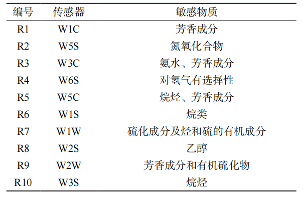 電子鼻配制傳感器對不同類型化合物響應如表 2。