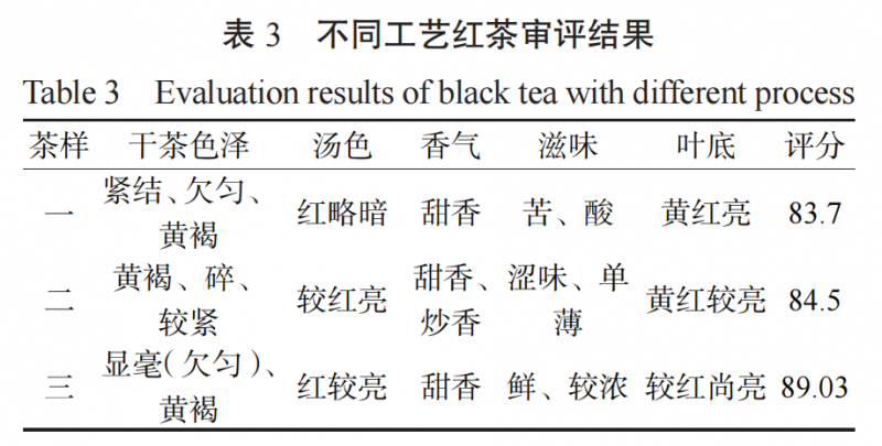 由表 3 可知:三號茶樣外形緊結顯毫,湯色紅較亮,滋味鮮濃,香氣給人一種舒適的甜香,葉底紅尚亮;一號茶樣外形緊結黃褐欠勻整,湯色較暗,滋味苦中帶酸,葉底黃紅亮;二號茶樣外形碎、黃褐,湯色較紅亮,甜香中帶有炒香,滋味較單薄,葉底黃紅較亮。