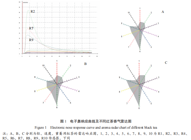 選取適度萎凋的響應曲線,即從圖中可以看出初始階段,R2、R7、R9 號傳感器的響應值較高,其他的較為平緩,并且 R2、R7、R9 號響應值也隨時間的延長,出現平緩的趨勢。由電子鼻響應曲線圖中可以看出在 T=118 s 開始各傳感器響應曲線逐漸趨于平穩,因此選取 T=120 s 時的穩態響應值作為分析點建立雷達圖,根據各傳感器對不同類物質的敏感程度,其響應值越高表明該類物質濃度越高。由圖 1 可知,在三種萎凋方式的紅茶香氣雷達響應圖中,對紅茶香氣敏感的傳感器有 R6、R9、R8、R7、R1和 R2,表明該三組紅茶香氣中烷類、醇類、芳香成分和有機硫化物、氨氧化合物含量較高。