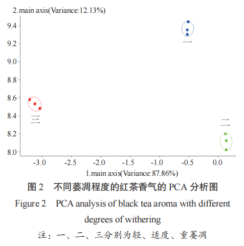 對不同萎凋程度的紅茶進行 PCA 分析(圖 2),得出第一主成分的貢獻率 87.860%,第二主成分貢獻率為 12.134%,總貢獻率為99.994%。主成分分析(PCA)就是對多指標的高維數據進行降維,提取數據中反應最大的幾個特征值對應的特征向量作為主成份,貢獻率越大, 說明該主成分在數據信息中越重要,越能最大限度地反映樣本最原始的信息。由圖 2 可知,不同萎凋程度的紅茶香氣成分在類別和含量上有了較大的變化,其中重萎凋在第一、第二主成分上明顯區別于輕萎凋和適度萎凋,表明重萎凋的工藝使紅茶香氣成分在類別和含量上發生了較為明顯的變化;輕萎凋和適度萎凋在第一主成分上差異不明顯。整體來說,萎凋程度不同,使紅茶香氣的成分表現出明顯的差異??芍獏^分度值越趨近于 1,表明兩種物質差異越明顯。表4中區分值都在99%以上,表明 PCA 可以將不同萎凋程度的紅茶區分開。