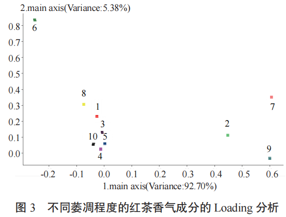 Loadings 分析,反映的是不同傳感器在紅茶香氣的區分中其貢獻的大小,一般通過傳感器在圖中的位置來判斷其貢獻的大小。傳感器與原點的距離越近,說明傳感器對樣品分析起到的作用越小,反之則表示作用越大。由圖 3 可得第一主成分起主要作用,這和 PCA 分析所得結論相同,R7 和 R9 傳感器對第一主成分貢獻率最大,R2 次之;R6 傳感器對第二主成分貢獻率最大,R8 次之。R4、R5、R10 傳感器負載較低,表明其對茶葉香氣成分敏感度較低。Loadings 分析表明在不同萎凋程度的紅茶區分中硫化物、芳香型化合物、氮氧化合物以及烷類、醇類化合物對區分貢獻有主要作用。