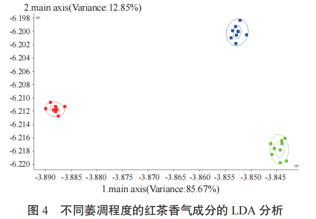 LDA 更側重于同一類別的空間分布狀態和距離的精度。LDA 分析是在 PCA 分析后對傳感器響應紅茶香氣成分的優化,通過擴大差異更直觀的表現不同提香工藝紅茶香氣之間的區別。圖 4 中第一主成分貢獻率為 85.67%,第二主成分貢獻率為 12.85%,總貢獻率為98.52%,能很好的反應紅茶香氣的信息。由圖4 得知,重萎凋與其他兩組距離較遠,可以在線性判別分析完全區分開;而在第一主成分的貢獻率中,輕萎凋和適度萎凋相差不大,這與 PCA 分析以及感官審評結果一致,表明這兩種萎凋程度對茶葉香氣的改變差異較小。整體結果對比 PCA 分析較為相似,說明電子鼻在區分不同萎凋程度的紅茶香氣中具有可行性。