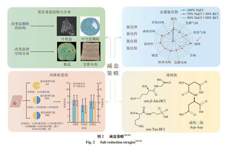 要達到“減鹽不減咸”的目的,可以基于以上咸味傳導途徑的特點,從多方面、多角度減少Na+過量攝入。如通過設計食物中Na+分布等,提高咀嚼過程中Na+在口腔中的釋放速率;或者使用非Na+的金屬鹽代替NaCl作為咸味調味品;除此之外,還可使用非離子型的風味促進劑,如咸味香精、咸味肽等提高咸味的感知。目前常見的減鹽策略如圖2所示。