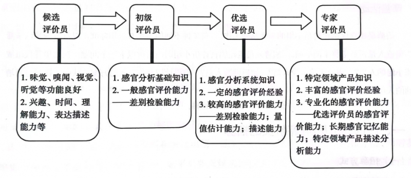 在感官評價的實踐中,往往根據(jù)不同檢驗的要求選用不同級別的評價員,不同級別的評價員要求如下: