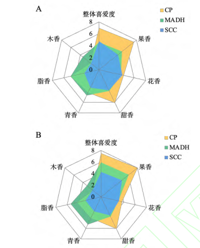 圖1 甜橙精油感官分析結果:(A)血橙精油;(B)臍橙精油