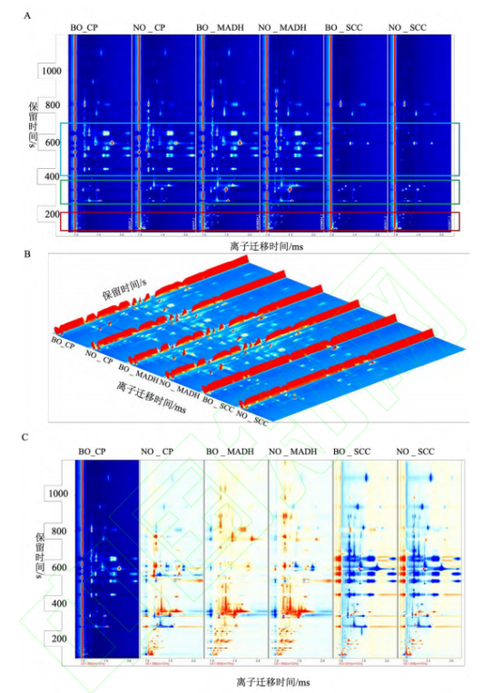 圖2 六種甜橙精油的揮發性物質GC-IMS二維(A)、三維(B)和二維差異譜圖(C)