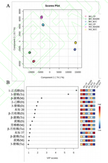 為了篩選六種精油的差異揮發性化合物,基于GC-IMS檢測到的64個物質的峰信號強度進行偏最小二乘法判別分析(PLS-DA)。如圖4A所示,PC1和PC2的貢獻率分別為74.1%和10.7%,累計貢獻率為84.8%,表明該模型能夠充分反映樣品原始信息。每一聚類中的3個點緊密聚集在一起,說明組間重復性好,GC-IMS檢測性能穩定。可以看出六種樣品有明顯的區分,NO_CP和NO_MADH均分布在上方區域,兩者差異較?。籅O_CP和BO_MADH均分布在左下方,兩者也較為相似;BO_SCC和NO_SCC均分布在右側區域,同樣具有一定相似性。對于同一種甜橙,CP和MADH兩種方式提取的精油距離相近,但和SCC萃取液相距較遠,說明前兩種方式和后者提取的揮發性成分差異較大。此外,同一種方式提取的兩種甜橙精油,如BO_CP和NO_CP,BO_MADH和NO_MADH,揮發性成分也具有較大差異。 進一步地,利用變量投影重要性(VIP)篩選對樣本分類貢獻大的揮發性化合物。VIP通過PLS-DA載荷圖判別所得,VIP值越大,表明對樣本分類的貢獻越大,通常VIP>1表明該變量在區分不同樣本上起著至關重要的作用。如圖4B所示,共篩選出15種VIP>1的標志性差異化合物,包括1-正戊醇(D)、3-蒈烯(Tr)、β-蒎烯(M)、2-己醇(D)、3-蒈烯(D)、未知20、β-月桂烯(D)、β-蒎烯(Tr)、莰烯(D)、芳樟醇(M)、β-月桂烯(Te)、未知37、β-蒎烯(Te)、莰烯(M)和3-蒈烯(Te)。其中絕大部為萜烯類化合物,少數為醇類,說明提取方式及柑橘品種對這兩類化合物影響較大。