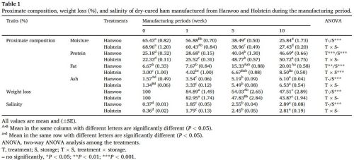 Table 1 Proximate composition, weight loss (%), and salinity of dry-cured ham manufactured from Hanwoo and Holstein during the manufacturing period.