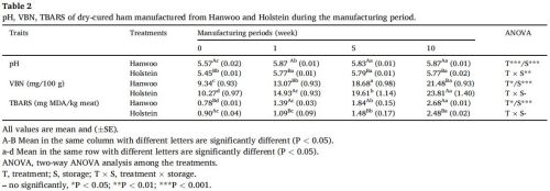 Table 2 pH, VBN, TBARS of dry-cured ham manufactured from Hanwoo and Holstein during the manufacturing period.