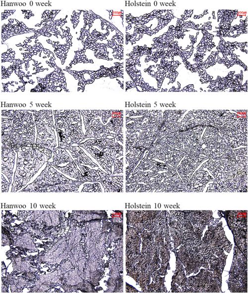 Fig. 1. Cross sectional area of dry-cured ham manufactured from Hanwoo and Holstein cattle during the manufacturing period. The magnification of all the microphotographs is ×40.