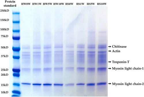 Fig. 2. SDS-PAGE analysis of dry-cured ham manufactured from Hanwoo and Holstein cattle during the manufacturing period. HW0W: Hanwoo 0 week, HW1W: Hanwoo 1 week; HW5W: Hanwoo 5 week, HW10W: Hanwoo 10 week; HS0W: Holstein 0 week; HS1W: Holstein 1 week; HS5W: Holstein 5 week; HS10W: Holstein 10 week.