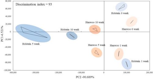 Fig. 3. Principal components analysis for dry-cured ham manufactured from Hanwoo and Holstein cattle during the manufacturing period.
