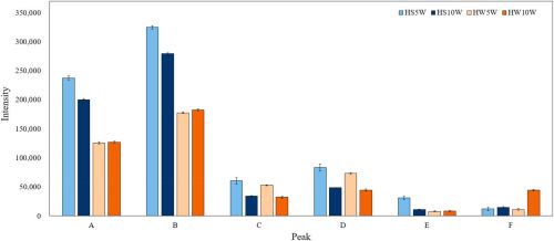 Fig. 4. The main volatile compounds in dry-cured ham manufactured from Hanwoo and Holstein cattle during the curing period. HW5W: Hanwoo 5 week, HW10W: Hanwoo 10 week; HS5W: Holstein 5 week; HS10W: Holstein 10 week. Peaks are presented in order of elution: A: Methanethiol; B: 2-propanol; C: butan-2-one; D: n-butanol; E: 3-3-ethyl-2-methyl-1,3-hexadiene; F: 3-Furanthiol.