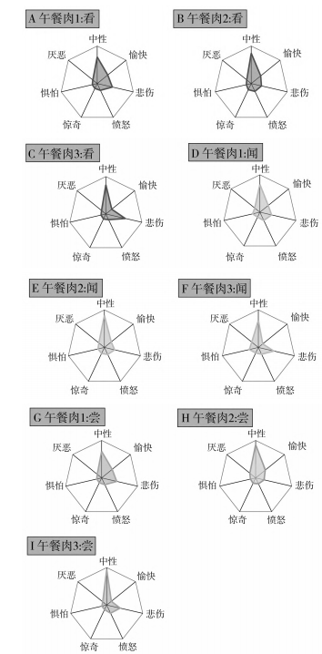 從“看”(視覺)分析得到的情緒雷達圖見圖2中A~C,能區別樣品口味的情緒是“悲傷”,午餐肉3占比最高,午餐肉2占比最低。受試者進行感官評價前,無影響情緒波動的因素存在,因此受試者的情緒表現與食物有關。在此實驗中,午餐肉3的消極評價更高,午餐肉2的消極評價最低,說明午餐肉2的外部整體特征更能提高實驗者的食欲。從“聞”(嗅覺)分析得到的情緒雷達圖見圖2中D~F,午餐肉1的氣味積極因素更多,“愉悅”情緒占比較大;而午餐肉3的氣味積極因素較少,消極因素更多。說明從氣味上判斷,午餐肉1的氣味更令人有食欲。從“嘗”(味覺)分析得到的情緒雷達圖見圖2中G~I,午餐肉1和午餐肉2的口感“愉悅”情緒顯著高于午餐肉3;而午餐肉1和午餐肉3的“悲傷”情緒顯著高于午餐肉2,說明從口感上判斷,午餐肉2更能提高實驗者的食欲。雖然從嗅覺評價上午餐肉1的氣味最佳,但從視覺和味覺上評價,午餐肉2的外觀和口感最佳。此結論與傳統的感官評價結論一致,午餐肉2是口感最佳的午餐肉樣品。