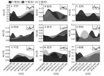 從情緒壓制上看,同樣地,午餐肉2引起的情緒反應最高;從積極情緒上觀察,午餐肉2在第8s時“愉悅”響應值突然增加,對應午餐肉1的響應值下降;而午餐肉2的“驚奇”響應值顯著高于另外兩種樣品;從消極情緒上觀察,午餐肉3的氣味更使人“懼怕”和“憤怒”,午餐肉2更讓人容易接受,這可能與午餐肉3有較多腥味、午餐肉2香味較高有關。以上結論都表明,午餐肉2從嗅覺上判斷,也是最能使人接受的一種樣品,此結論與感官評價吻合。