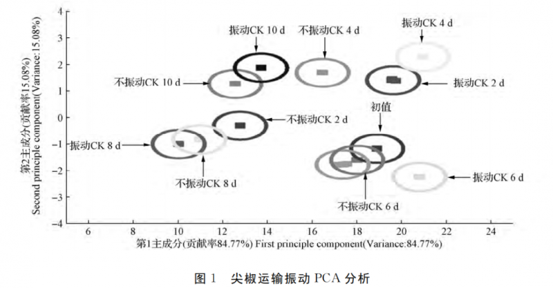 如圖5所 示,為運輸振動 CK 和不振動 CK青圓椒的 PCA 分析圖(A 組),2組的尖椒主成分1的貢獻率 為 97.05%,主成分 2 的貢獻率為2.85%,總貢獻率 為99.90%。表明2個主成分已經基本代表了樣品的主要信息特征,電子鼻能夠對樣品和貯藏時間加以區分。從 圖5可以看出,青圓椒的振動 CK 和不振動 CK10d內的揮發性物質成分區域較為接近,且不同貯藏時間內揮發性物質成分區域有重疊,說明振動組和不振動組貯藏10d內的青圓椒果實揮發性物質變化不大,在貯藏期內,運輸振動和不振動對青圓椒的氣味影響不大,均可保持青圓椒的香氣。