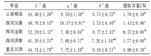 采用全自動色差儀測量魚片表面的顏色,每次測試前進行校準(zhǔn)。測量白度(L*值)、紅度(a*值)和黃度(b*值)。不同產(chǎn)地的青花椒對花椒魚片的色澤和脂肪含量的影響不同,結(jié)果見表2。